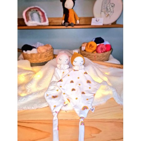 Doudou en crochet et tissus fabriqué à la main en France avec beaucoup d'amour. Chaque modèle est unique et original, c'est tout le bonheur du fait main.